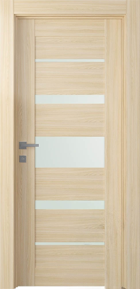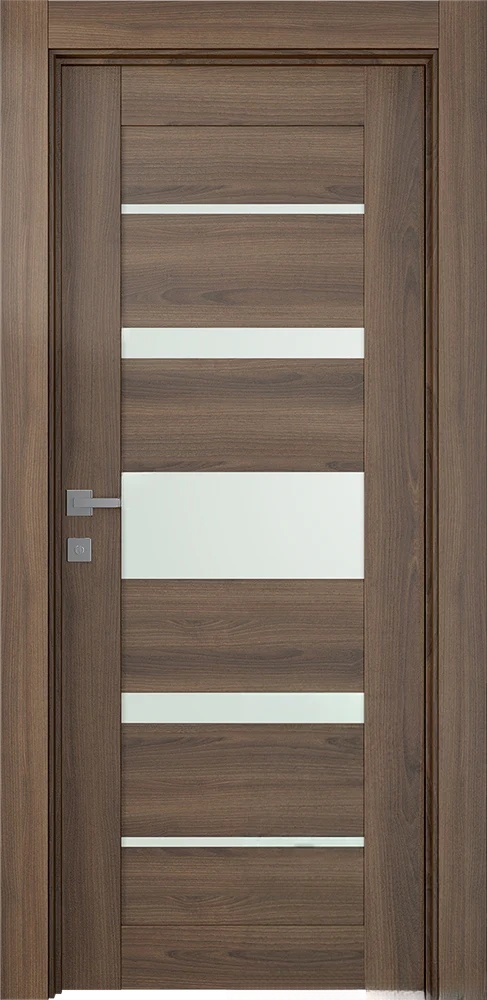 Modern design: eco-friendly materials, straight lines, and glass panels are the hallmarks of the door in a classic style with hi-tech highlights. The minimalistic design of the slab will fit harmoniously into every room. This door features six rectangular panels alternated with five frosted white glass inserts of different widths. Thanks to the noble shade, Avon 07-03 Vetro will refresh your interior and become an accent piece of your home or apartment.